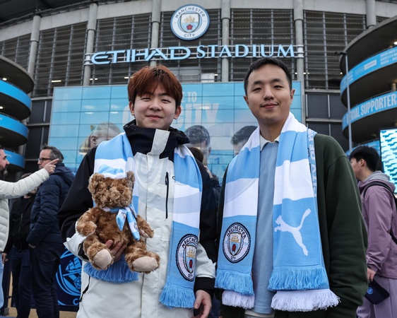 Fans pose for a selfie during the Premier League match Manchester City vs Liverpool at Etihad Stadium, Manchester, United Kingdom, 9th November 2025, Credit:Mark Cosgrove/News Images / Avalon