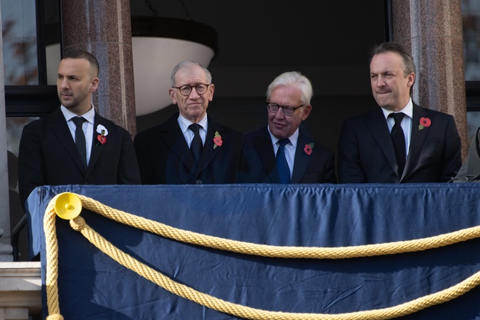 (L-R) - Zach Polanski - Green Party Leader, Philip May - husband of Theresa May, guest, Hugh O'Leary - husband of Liz Truss, and Bishop Kenneth Nowakowski- Ukrainian Catholic Eparchy of Holy Family of London attend a Remembrance Sunday Service in Whitehall in London, England, UK on Sunday 9 November, 2025 to commemorate the contribution of British and Commonwealth military and civilian servicemen and women in the two World Wars and later conflict., Credit:Justin Ng / Avalon