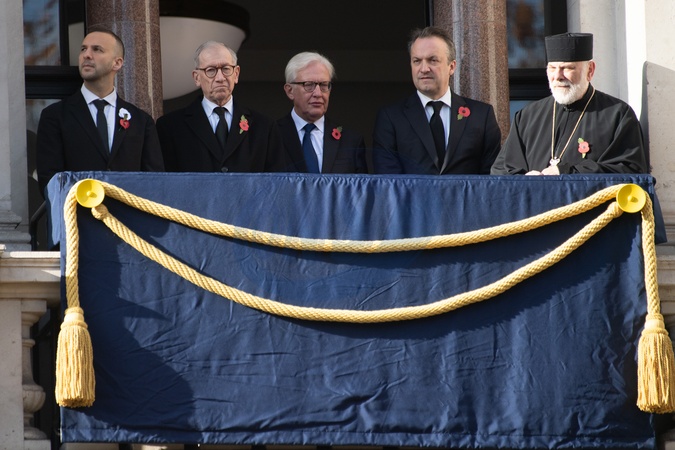 (L-R) - Zach Polanski - Green Party Leader, Philip May - husband of Theresa May, guest, Hugh O'Leary - husband of Liz Truss, and Bishop Kenneth Nowakowski- Ukrainian Catholic Eparchy of Holy Family of London attend a Remembrance Sunday Service in Whitehall in London, England, UK on Sunday 9 November, 2025 to commemorate the contribution of British and Commonwealth military and civilian servicemen and women in the two World Wars and later conflict., Credit:Justin Ng / Avalon