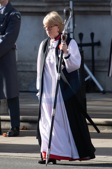 Bishop of London Sarah Mullally (and future archbishop of Canterbury) attend a Remembrance Sunday Service in Whitehall in London, England, UK on Sunday 9 November, 2025 to commemorate the contribution of British and Commonwealth military and civilian servicemen and women in the two World Wars and later conflict., Credit:Justin Ng / Avalon