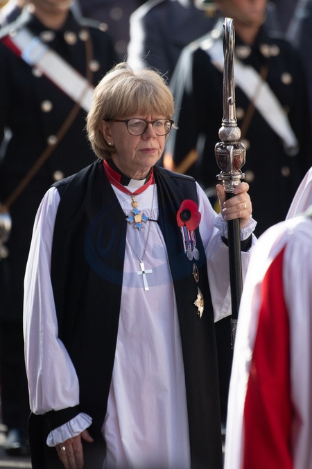 Bishop of London Sarah Mullally (and future archbishop of Canterbury) attend a Remembrance Sunday Service in Whitehall in London, England, UK on Sunday 9 November, 2025 to commemorate the contribution of British and Commonwealth military and civilian servicemen and women in the two World Wars and later conflict., Credit:Justin Ng / Avalon