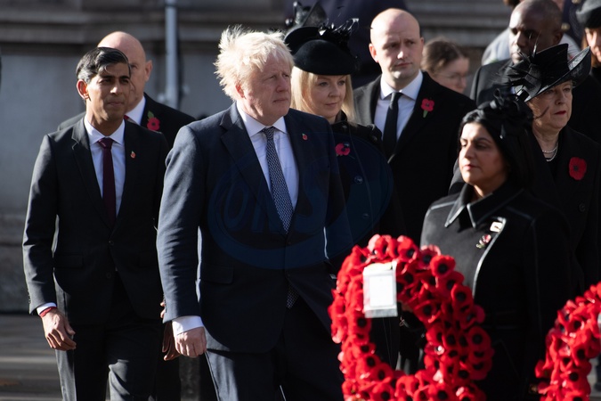 Former Prime Ministers Rishi Sunak, Boris Johson, Liz Truss attend a Remembrance Sunday Service in Whitehall in London, England, UK on Sunday 9 November, 2025 to commemorate the contribution of British and Commonwealth military and civilian servicemen and women in the two World Wars and later conflict., Credit:Justin Ng / Avalon
