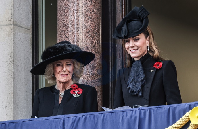Queen Camilla and Catherine, Princess of Wales watch the service of Remembrance from the balcony overlooking the Cenotaph. London, United Kingdom, 09 November 2025., Credit:RICHARD POHLE / Avalon