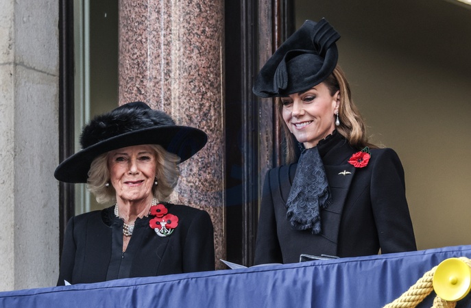 Queen Camilla and Catherine, Princess of Wales watch the service of Remembrance from the balcony overlooking the Cenotaph. London, United Kingdom, 09 November 2025., Credit:Richard Pohle / Avalon