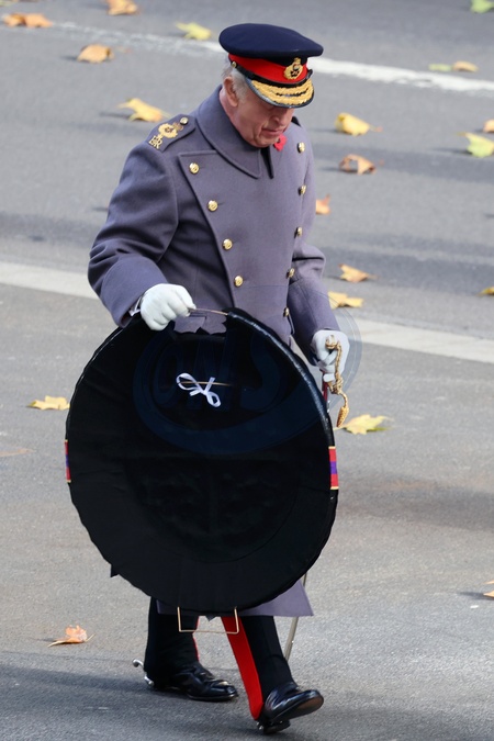 LONDON, ENGLAND - NOVEMBER 09: King Charles III lays a wreath during the 2025 National Service Of Remembrance at The Cenotaph on November 09, 2025 in London, England. Every year, members of the British Royal Family join politicians, veterans and members of the public to remember those who have died in combat., Credit:Chris Jackson / Avalon