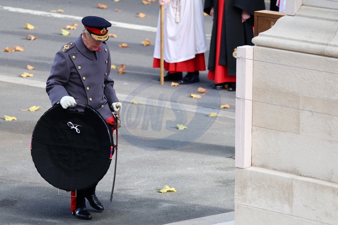 LONDON, ENGLAND - NOVEMBER 09: King Charles III lays a wreath during the 2025 National Service Of Remembrance at The Cenotaph on November 09, 2025 in London, England. Every year, members of the British Royal Family join politicians, veterans and members of the public to remember those who have died in combat., Credit:Chris Jackson / Avalon