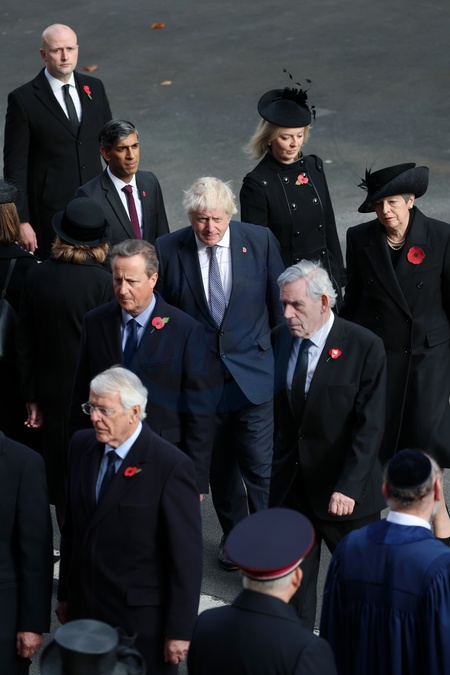 LONDON, ENGLAND - NOVEMBER 09: Former Prime Ministers John Major, Rishi Sunak, David Cameron, Boris Johnson, Liz Truss, Gordon Brown and Theresa May during the 2025 National Service Of Remembrance at The Cenotaph on November 09, 2025 in London, England. Every year, members of the British Royal Family join politicians, veterans and members of the public to remember those who have died in combat., Credit:Chris Jackson / Avalon