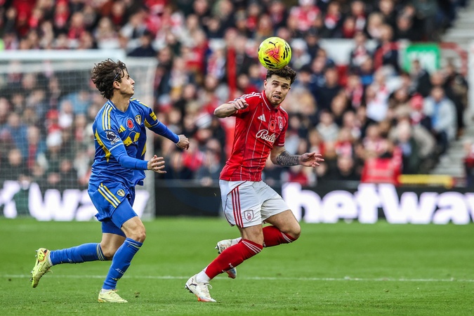 Neco Williams of Nottingham Forest controls the ball under pressure from Brenden Aaronson of Leeds United during the Premier League match Nottingham Forest vs Leeds United at City Ground, Nottingham, United Kingdom, 9th November 2025, Credit:Ae Cosgrove/News Images / Avalon