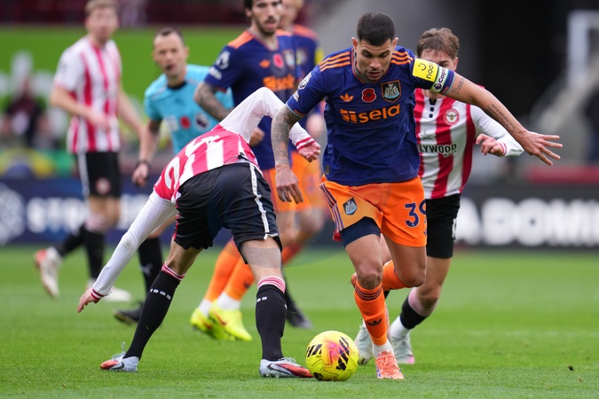 Bruno Guimarães of Newcastle United on the ball under pressure during the Premier League match Brentford vs Newcastle United at The Gtech Community Stadium, London, United Kingdom, 9th November 2025, Credit:Harvey Murphy/News Images / Avalon