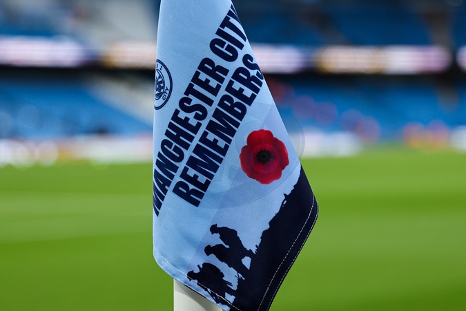 Manchester City corner flag showing remembrance poppy ahead of the Premier League match Manchester City vs Liverpool at Etihad Stadium, Manchester, United Kingdom, 9th November 2025, Credit:Mark Cosgrove/News Images / Avalon