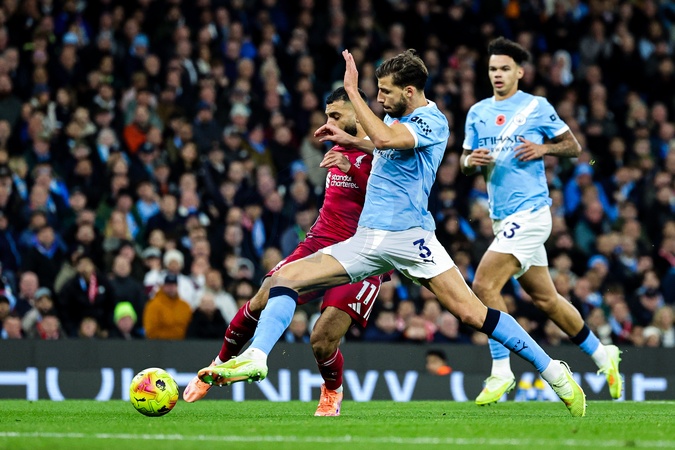 Mohamed Salah of Liverpool takes shot under pressure from Ruben Dias of Manchester City during the Premier League match Manchester City vs Liverpool at Etihad Stadium, Manchester, United Kingdom, 9th November 2025, Credit:Mark Cosgrove/News Images / Avalon