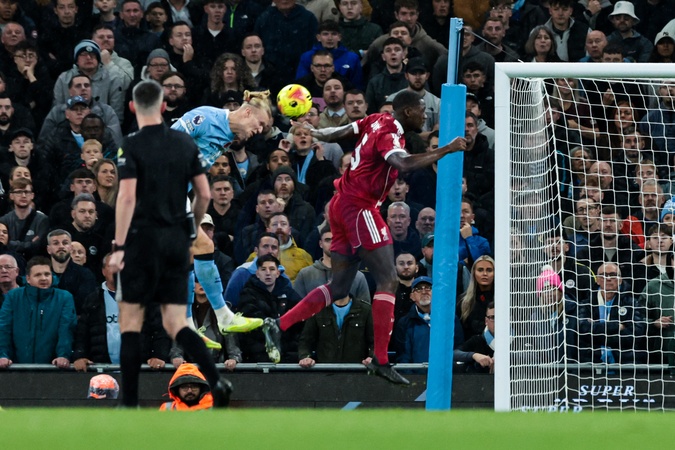 Erling Haaland of Manchester City shoots and scores to make it 1-0 during the Premier League match Manchester City vs Liverpool at Etihad Stadium, Manchester, United Kingdom, 9th November 2025, Credit:Mark Cosgrove/News Images / Avalon