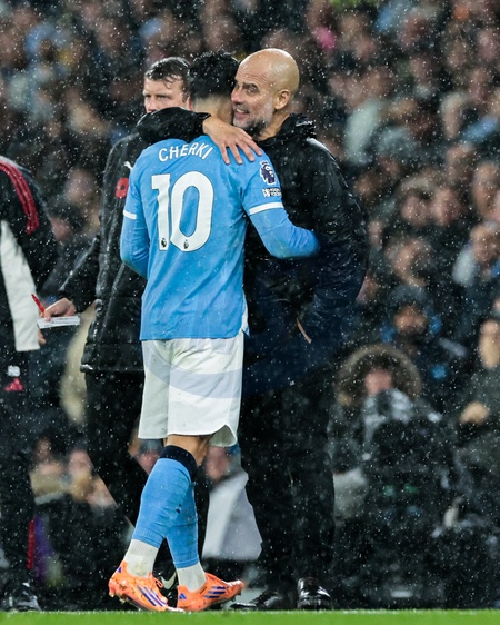 Pep Guardiola Manchester City manager shakes hands with Rayan Cherki of Manchester City as he is substituted during the Premier League match Manchester City vs Liverpool at Etihad Stadium, Manchester, United Kingdom, 9th November 2025, Credit:Mark Cosgrove/News Images / Avalon