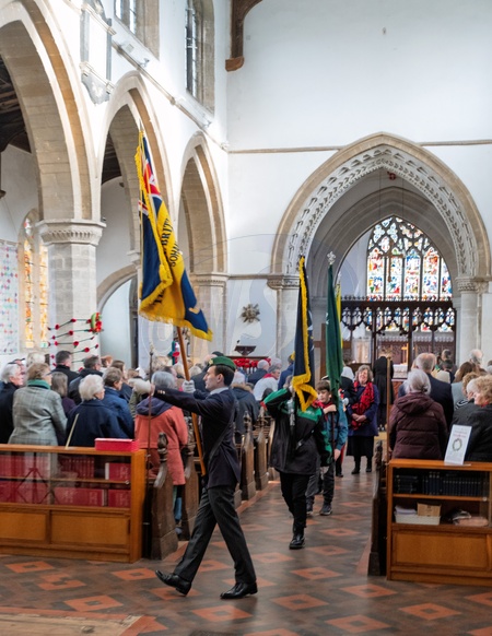 Remembrance Sunday march , with wreath laying and church service at St Andrew's church, Soham, Cambridgeshire, UK.