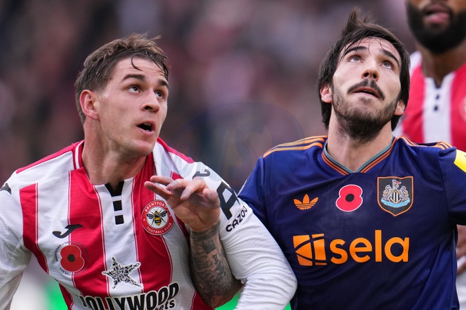 Sandro Tonali of Newcastle United and Yehor Yarmolyuk of Brentford battle during the Premier League match Brentford vs Newcastle United at The Gtech Community Stadium, London, United Kingdom, 9th November 2025, Credit:Harvey Murphy/News Images / Avalon