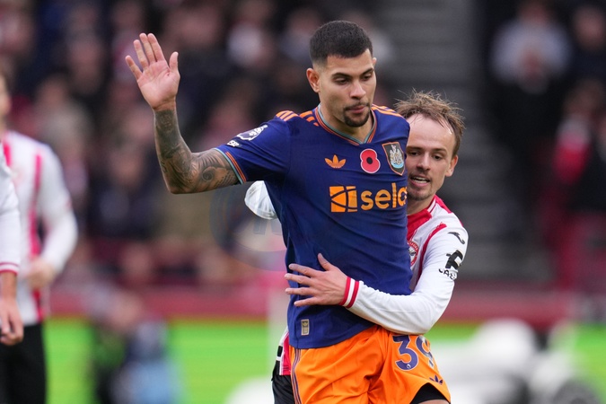 Mikkel Damsgaard of Brentford and Bruno Guimarães of Newcastle United during the Premier League match Brentford vs Newcastle United at The Gtech Community Stadium, London, United Kingdom, 9th November 2025, Credit:Harvey Murphy/News Images / Avalon