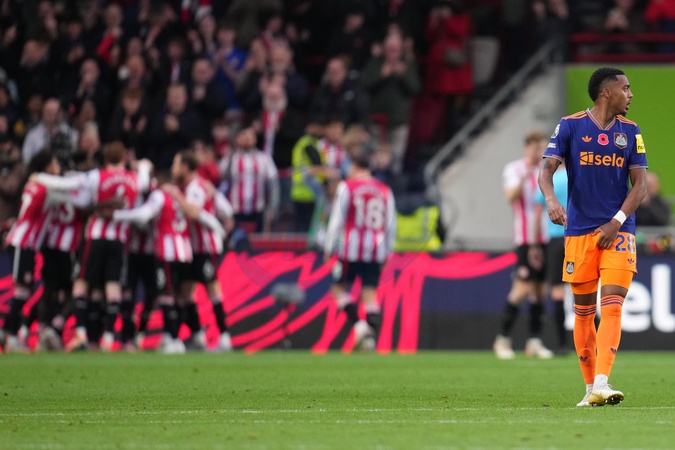 Brentford players celebrate second goal whilst Joe Willock of Newcastle United looks on during the Premier League match Brentford vs Newcastle United at The Gtech Community Stadium, London, United Kingdom, 9th November 2025, Credit:Harvey Murphy/News Images / Avalon