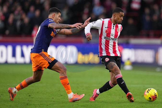 Reiss Nelson of Brentford plays a pass under pressure from Bruno Guimarães of Newcastle United during the Premier League match Brentford vs Newcastle United at The Gtech Community Stadium, London, United Kingdom, 9th November 2025, Credit:Harvey Murphy/News Images / Avalon