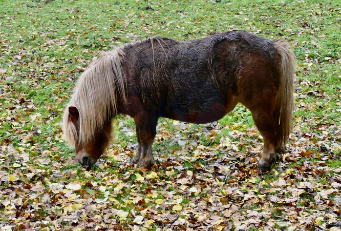 A soaking wet miniature pony with muddy hooves in a wet fields on a rainy morning in the countryside., Credit:Geoffrey Swaine / Avalon
