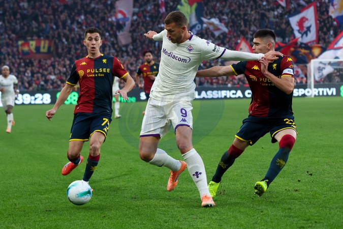 Ferraris Stadium. Serie A football championship, day 11, Genoa-Fiorentina. Pictured: Masini, Dzeko and Vasquez . Genova, Italy 09 November 2025, Credit:Gabriele Siri / Avalon