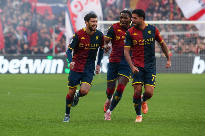 Ferraris Stadium. Serie A football championship, day 11, Genoa-Fiorentina. Pictured: celebration by Martin, Norton-Cuffy and Ellertsson . Genova, Italy 09 November 2025, Credit:Gabriele Siri / Avalon