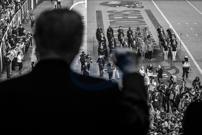 President Donald Trump delivers the Oath of Enlistment alongside Secretary of War Pete Hegseth during a "Salute to Service” halftime ceremony honoring active-duty service members, veterans, and their families ahead of Veterans Day at Northwest Stadium in Landover, Maryland, Sunday, November 9, 2025., Credit:Daniel Torok / Avalon