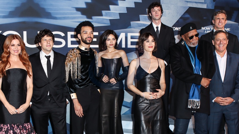 MANHATTAN, NEW YORK CITY, NEW YORK, USA - NOVEMBER 10: Australian actress Isla Fisher, American actor, writer, director, and playwright Jesse Eisenberg, American actor Justice Smith, American actress Ariana Greenblatt, American actress Lizzy Caplan, American actor Dominic Sessa, American actor, producer, and narrator Morgan Freeman, Adam Fogelson and Ruben Fleischer arrive at the New York Premiere Of Lionsgate's 'Now You See Me: Now You Don't' held at The Lighthouse at Chelsea Piers on November 10, 2025 in Manhattan, New York City, New York, United States., Credit:Image Press Agency / Avalon