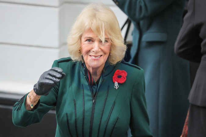 London, UK. 11th Nov, 2025. Her Majesty smiles and waves at members of the public. Queen Camilla arrives by Train into Paddington Station and joins 'Poppies for Paddington' the Commemorations on Armistice Day. 'Poppies to Paddington' is an annual commemoration. Poppy wreaths from around the GWR network are collected by designate trains, arriving into Paddington station before 1100, followed by a 2 minute silence and commemorative proceedings., Credit:Imageplotter / Avalon