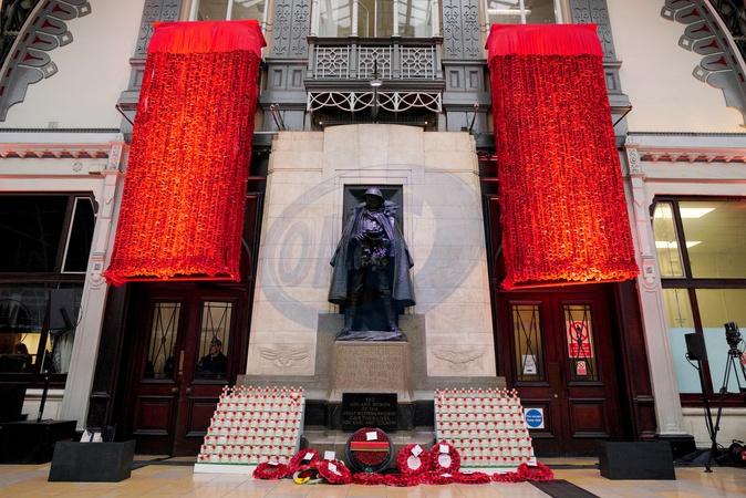 The Great Western Railway War Memorial at London Paddington train station adorned with poppies and wreaths to mark Armistice Day. Picture date: Tuesday November 11, 2025., Credit:Ben Birchall / Avalon