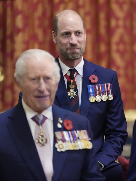 King Charles III and the Prince of Wales at a reception for veterans who served in the Pacific during the Second World War, part of the commemorations marking the 80th anniversary of VJ Day, at Windsor Castle, Berkshire. Picture date: Tuesday November 11, 2025., Credit:Andrew Matthews / Avalon