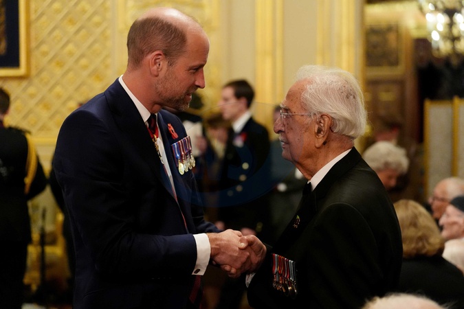 The Prince of Wales and veteran Yavar Abbas at a reception for veterans who served in the Pacific during the Second World War, part of the commemorations marking the 80th anniversary of VJ Day, at Windsor Castle, Berkshire. Picture date: Tuesday November 11, 2025., Credit:Jonathan Brady / Avalon