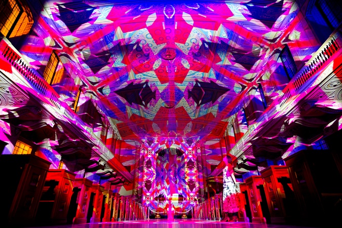 Greenwich glows again: Time by Luxmuralis lights up the Old Royal Naval College, from the home of Greenwich Mean Time., Credit:Aldo Ciarrocchi / Avalon
