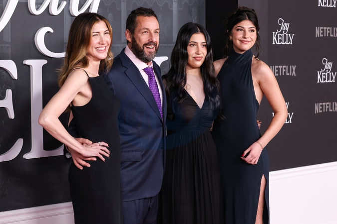 HOLLYWOOD, LOS ANGELES, CALIFORNIA, USA - NOVEMBER 11: American actress and former model Jackie Sandler, hubsand/American actor and comedian Adam Sandler with daughters/American actresses Sadie Sandler and Sunny Sandler arrive at the Los Angeles Premiere Of Netflix's 'Jay Kelly' held at The Egyptian Theatre Hollywood on November 11, 2025 in Hollywood, Los Angeles, California, United States., Credit:Xavier Collin / Avalon