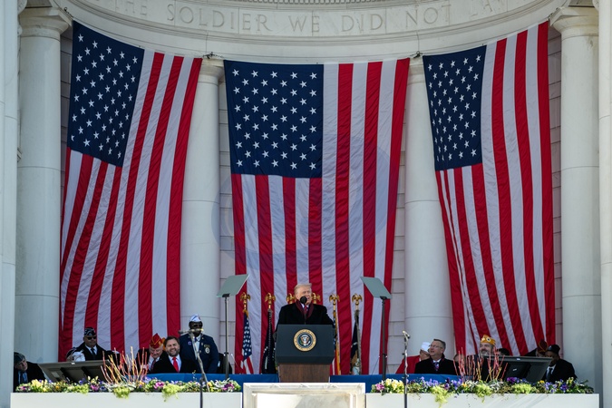 President Donald Trump delivers remarks at a Veterans Day ceremony at the Memorial Amphitheater at Arlington National Cemetery, Tuesday, November 11, 2025, in Arlington, Virginia., Credit:Daniel Torok / Avalon