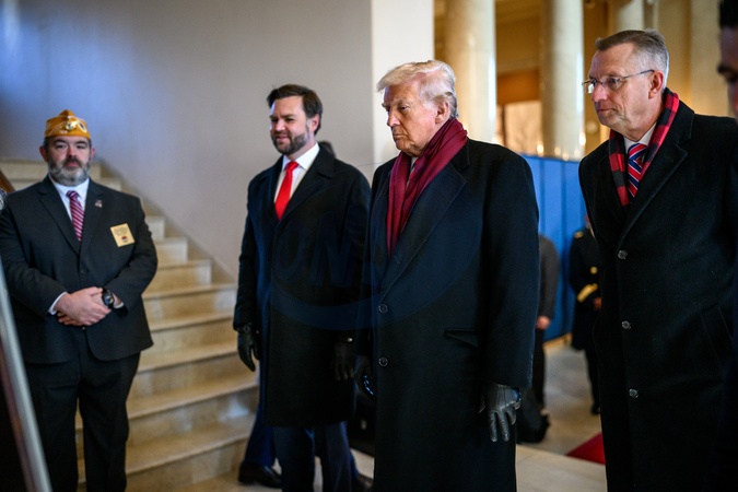 President Donald Trump, Vice President JD Vance, and Secretary of Veterans Affairs Doug Collins walk towards the stage during Veterans Day ceremonies at Arlington National Cemetery in Arlington, Virginia, Tuesday, November 11, 2025., Credit:Daniel Torok / Avalon