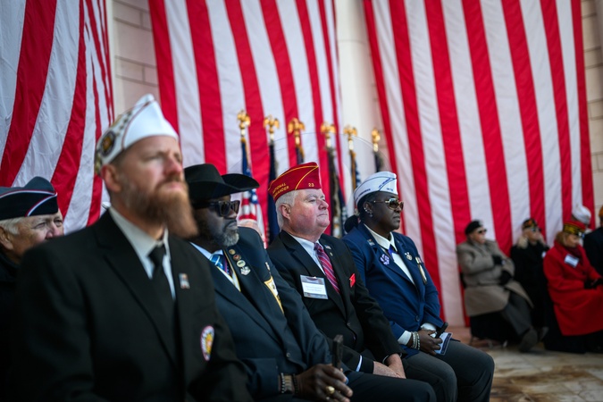 U.S. Veterans listen as President Donald Trump delivers remarks at a Veterans Day ceremony at the Memorial Amphitheater at Arlington National Cemetery, Tuesday, November 11, 2025, in Arlington, Virginia., Credit:Daniel Torok / Avalon