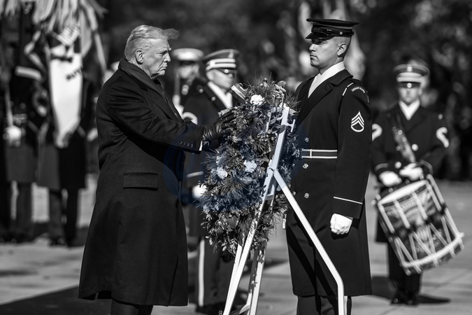 President Donald Trump participates in a wreath-laying ceremony at the Tomb of the Unknown Soldier in observance of Veterans Day, Tuesday, November 11, 2025, at Arlington National Cemetery in Arlington, Virginia., Credit:Daniel Torok / Avalon