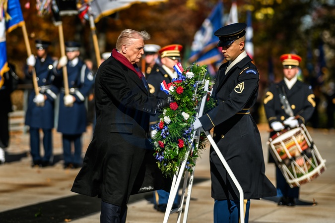 President Donald Trump participates in a wreath-laying ceremony at the Tomb of the Unknown Soldier in observance of Veterans Day, Tuesday, November 11, 2025, at Arlington National Cemetery in Arlington, Virginia., Credit:Daniel Torok / Avalon