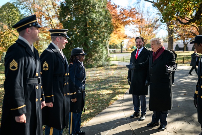 President Donald Trump and Vice President JD Vance speak with members of the military as they depart a Veterans Day ceremony at the Memorial Amphitheater at Arlington National Cemetery, Tuesday, November 11, 2025, in Arlington, Virginia., Credit:Daniel Torok / Avalon