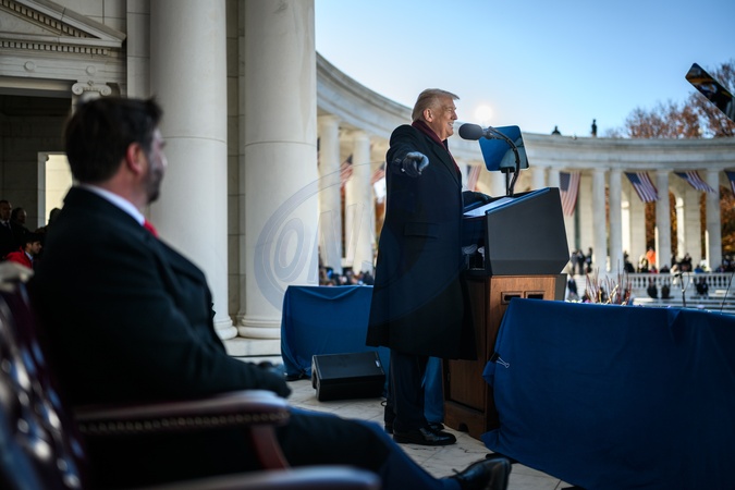 President Donald Trump delivers remarks at a Veterans Day ceremony at the Memorial Amphitheater at Arlington National Cemetery, Tuesday, November 11, 2025, in Arlington, Virginia., Credit:Daniel Torok / Avalon