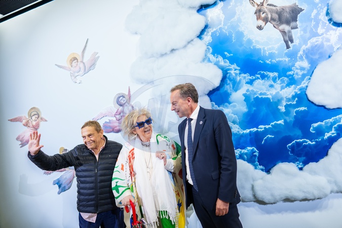 The inauguration of Raffaele Curi's "Prayer to Go to Heaven with Donkeys - Preghiera per andare in Paradiso con gli asinelli - Homage to Francis Jammes," held at the Palazzo Rhinoceros of the Alda Fendi - Esperimenti Foundation. Pictured: Raffaele Curi, Alda Fendi, and French Ambassador Martin Briens. Rome, Nov 10th 2025, Credit:Luigi Narici/AGF / Avalon