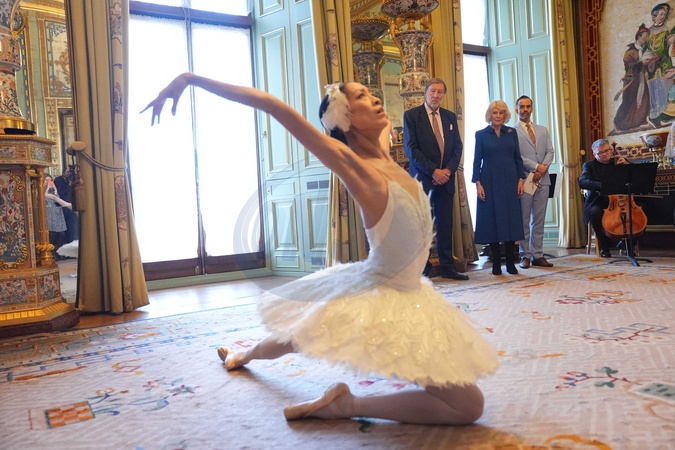 Queen Camilla, Patron of the English National Ballet, watching Sangeun Lee performing during a reception with staff, dancers, and supporters to celebrate the company's 75th anniversary and recognise the heritage, innovative creation of new works, and their learning and engagement programme, at Buckingham Palace in central London. Picture date: Wednesday November 12, 2025., Credit:Yui Mok / Avalon