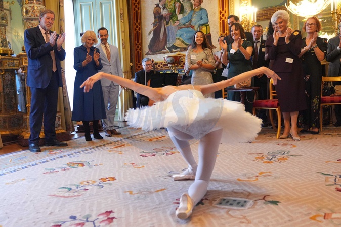Queen Camilla, Patron of the English National Ballet, watching Sangeun Lee performing during a reception with staff, dancers, and supporters to celebrate the company's 75th anniversary and recognise the heritage, innovative creation of new works, and their learning and engagement programme, at Buckingham Palace in central London. Picture date: Wednesday November 12, 2025., Credit:Yui Mok / Avalon