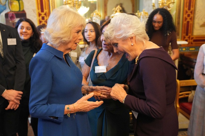 Queen Camilla, Patron of the English National Ballet, speaks with Arlene Phillips and Angela Rippon during a reception with staff, dancers, and supporters to celebrate the company's 75th anniversary and recognise the heritage, innovative creation of new works, and their learning and engagement programme, at Buckingham Palace in central London. Picture date: Wednesday November 12, 2025., Credit:Yui Mok / Avalon
