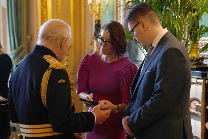 Mrs. Andrea Irvine (Widow) receives the Elizabeth Emblem from King Charles III at Windsor Castle, Berkshire, for Reserve Constable Kenneth Irvine. Picture date: Wednesday November 12, 2025., Credit:Jonathan Brady / Avalon