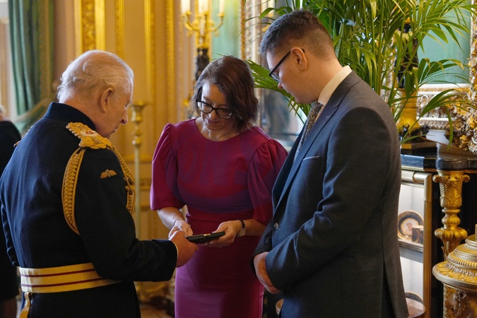 Mrs. Andrea Irvine (Widow) receives the Elizabeth Emblem from King Charles III at Windsor Castle, Berkshire, for Reserve Constable Kenneth Irvine. Picture date: Wednesday November 12, 2025., Credit:Jonathan Brady / Avalon