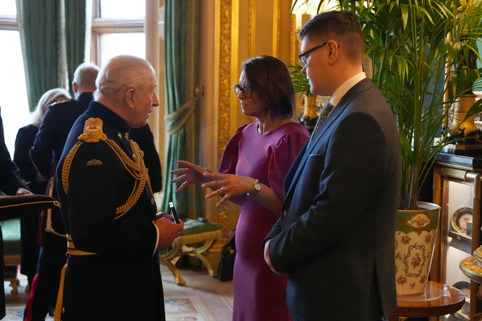Mrs. Andrea Irvine (Widow) receives the Elizabeth Emblem from King Charles III at Windsor Castle, Berkshire, for Reserve Constable Kenneth Irvine. Picture date: Wednesday November 12, 2025., Credit:Jonathan Brady / Avalon