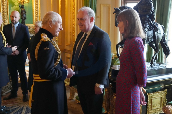 Mr. Andrew Murphy (Son) receives the Elizabeth Emblem from King Charles III at Windsor Castle, Berkshire, for Detective Inspector David Murphy, Royal Ulster Constabulary. Picture date: Wednesday November 12, 2025., Credit:Jonathan Brady / Avalon