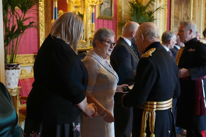 Mrs. Thelma Corkey (Widow) receives the Elizabeth Emblem from King Charles III at Windsor Castle, Berkshire, for Reserve Constable Snowden Corkey, Picture date: Wednesday November 12, 2025., Credit:Jonathan Brady / Avalon