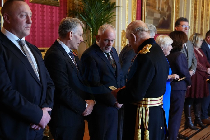 Mr. Paul Toombs (Son) receives the Elizabeth Emblem from King Charles III at Windsor Castle, Berkshire, for Mr. William Toombs, H.M. Customs. Picture date: Wednesday November 12, 2025., Credit:Jonathan Brady / Avalon